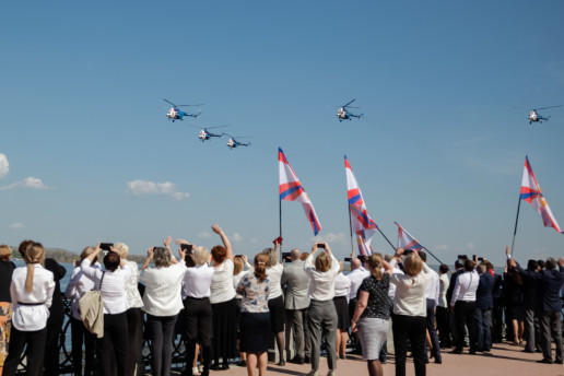 Две группы винтокрылых машин – два вертолета Ми-8 и пять Ми-2 дважды пролетели над самарской набережной, символизируя высокий полет и движение вперед к поставленной цели Центрального спортивного клуба Армии.