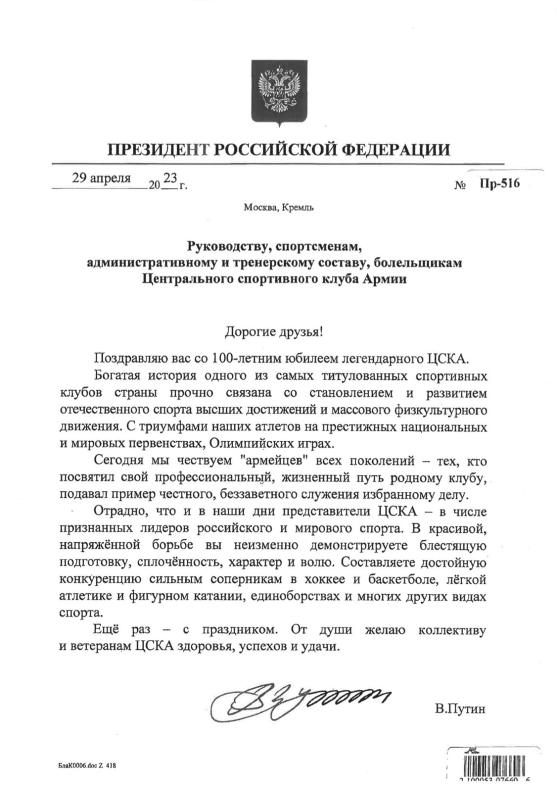 Президент Российской Федерации Владимир Владимирович Путин поздравил руководство, спортсменов, административный и тренерский состав ЦСКА с 100-летием клуба. Телеграмма опубликована сегодня, 29 апреля, на сайте Кремля.