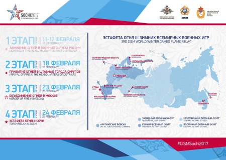 «Горящее пламя уже много столетий считается символом начала важных спортивных соревнований, и это очень символично, что в скором времени огни из разных уголков России прибудут в Москву. Эстафета спортивного огня III зимних Всемирных военных игр продолжает традиции чести и доблести, духа постоянного состязания и преодоления себя, она становится еще одним символом единства нашей страны и развития Вооруженных Сил для поддержания мира и защиты Родины», – отметил начальник ЦСКА полковник Михаил Барышев.