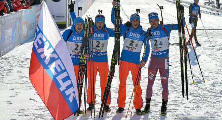 Второе место заняли австрийцы, а третье - норвежцы. Сборная России на четвертом месте. В составе российской команды в эстафете бежали Максим Цветков (ЦСКА), Евгений Гараничев, Антон Бабиков (ЦСКА), Антон Шипулин.