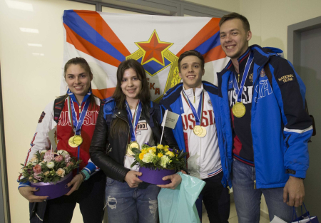Под аплодисменты болельщиков и журналистов в зону прилета вышли Андрей Гладков, Константин Лоханов, Ольга Никитина и Софья Позднякова – этот квартет армейцев принес в копилку юниорской сборной России четыре медали: три «золота» и одну «бронзу».