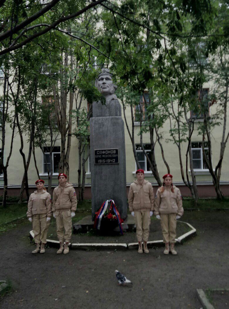 Ребята прибрались на территории возле бюста, установленного на улице Сафонова в Североморске, и возложили к нему венок.