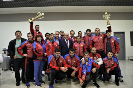 В Шереметьево вместе со спортсменами прилетели капитан сборной российской армии Вячеслав Степаненко, а также тренеры: олимпийский чемпион Афин-2004 по греко-римской борьбе майор ВС РФ Алексей Мишин, чемпион мира-2014 по вольной борьбе старший лейтенант ВС РФ Абдусалам Гадисов и Таймураз Джиоев.