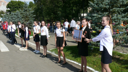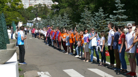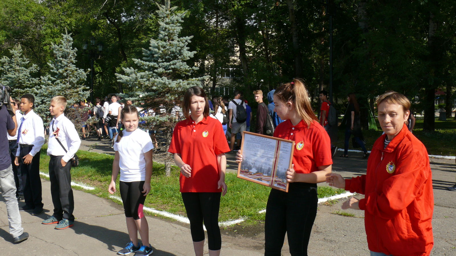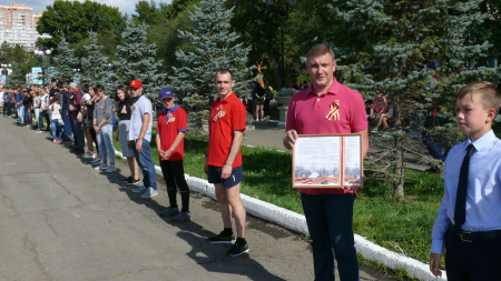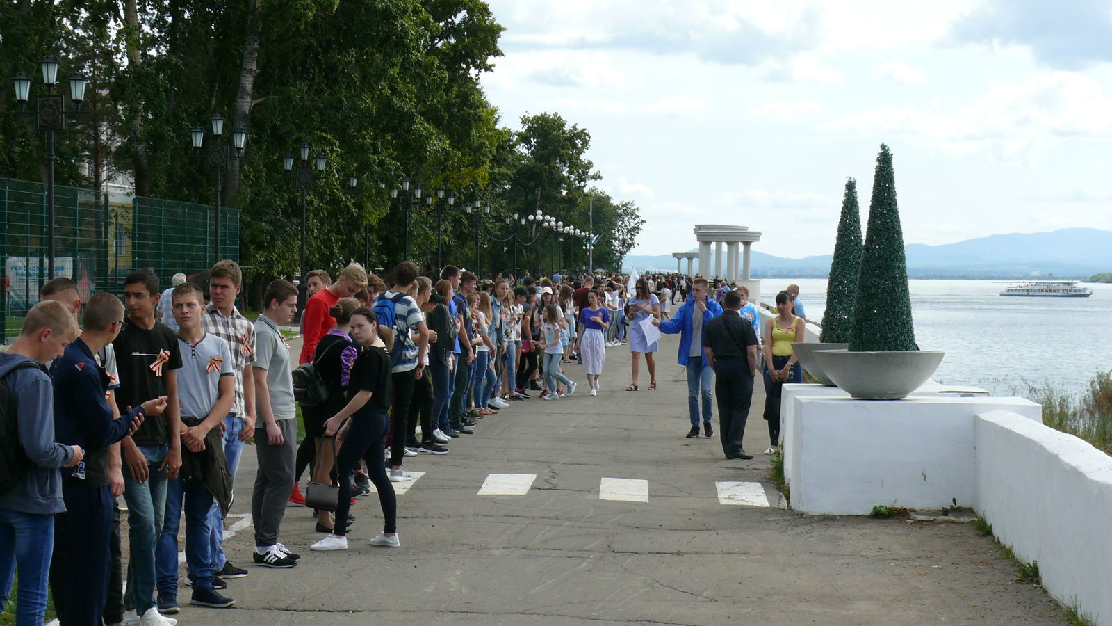 Получив бело-желто-красные муаровые ленточки, идентичные по цвету ленте с колодки медали «За победу над Японией», молодёжь краевой столицы выстроилась в «Стену памяти и дружбы», которая протянулась по набережной Амура им. адмирала Невельского от памятника Маршалу Советского Союза Р. Я. Малиновскому до памятника Маршалу Советского Союза А. М. Василевскому.