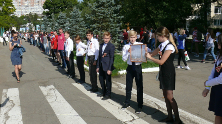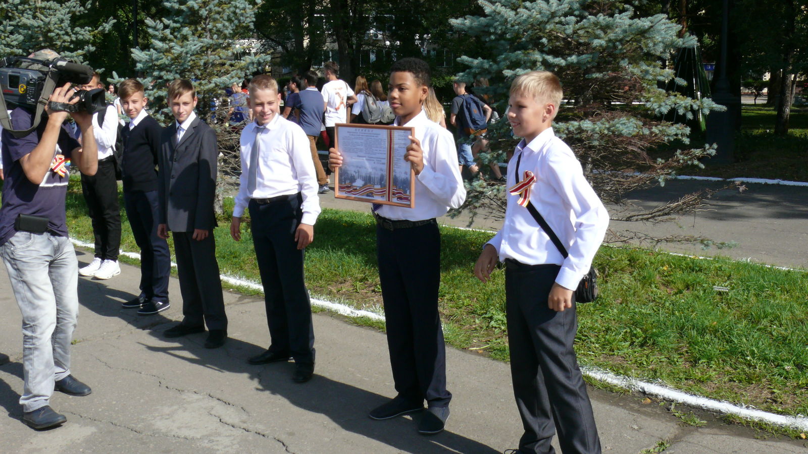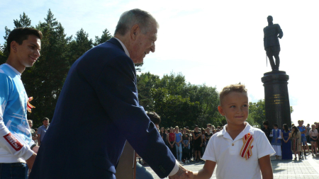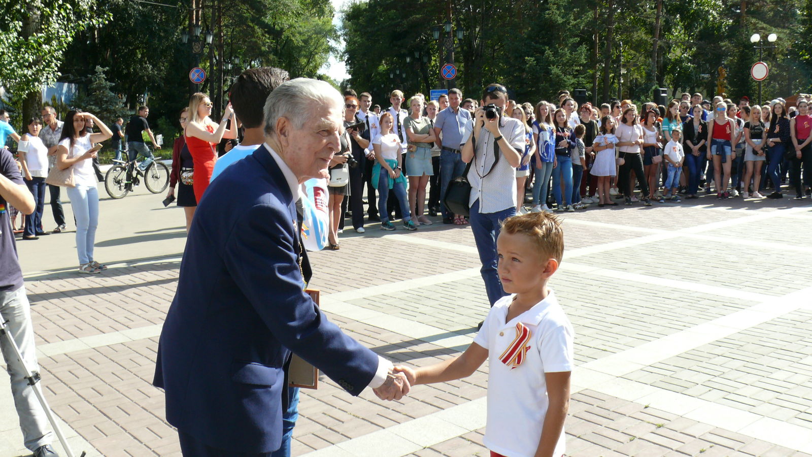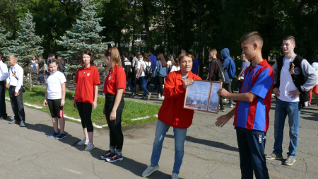 Пройдя через всю цепочку участников, текст приказа был передан ребёнку, который символизировал будущее поколение, а тот в свою очередь передал его ветерану войны с Японией Николаю Михайловичу Христофорову, поблагодарив его за Победу.