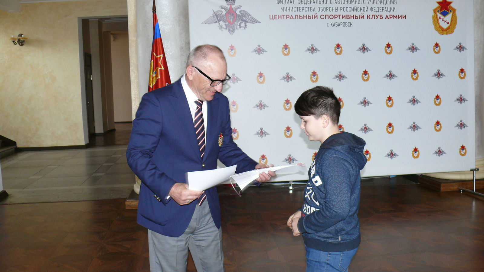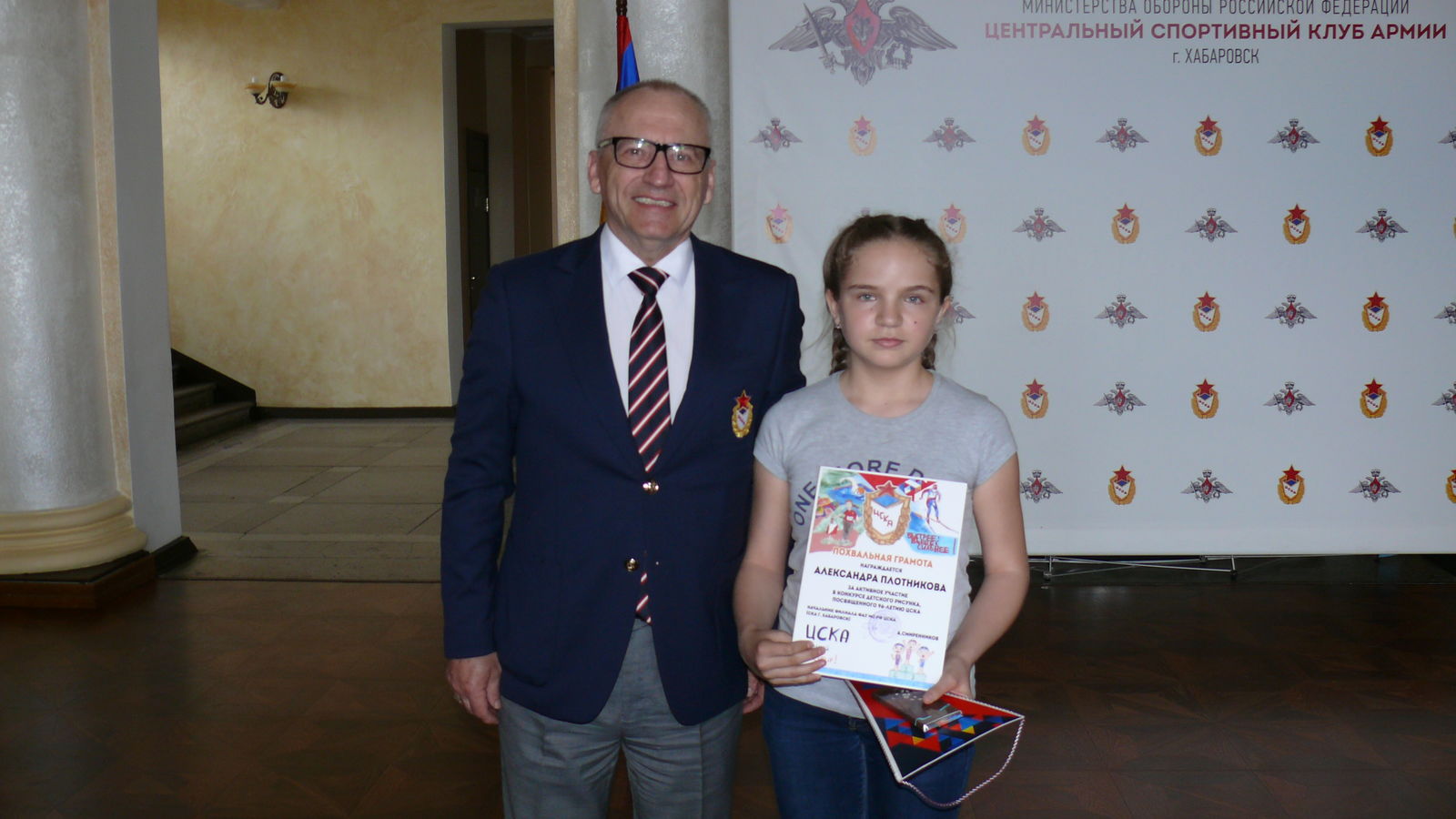 Но в итоге награды нашли героев. Для вручения призов, грамот, вымпелов и сладких подарков сотрудники филиала устроили торжественное построение. Начальник филиала ФАУ МО РФ ЦСКА (СКА, г. Хабаровск) Александр Смиренников тепло поблагодарил детей, принявших участие в конкурсе, и лично вручил победителям награды.