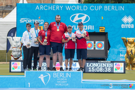 В споре смешанных пар по стрельбе из блочного лука за третье место армеец Александр Дамбаев и Виктория Бальжанова одержали победу над представителями Италии (151:149). Победителями этапа стали спортсмены из Великобритании, которые в финале оказались сильнее лучников из Словении (156:155).