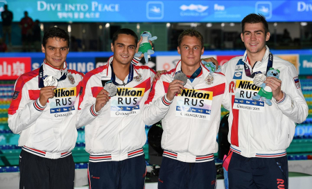 Бронзовый призёр Олимпийских игр, многократный призёр чемпионатов мира, многократный победитель и призёр чемпионатов мира на короткой воде, двукратный чемпион Европы, многократный победитель и призёр чемпионатов Европы на короткой воде, четырёхкратный победитель Универсиады Владимир Морозов и трехкратный серебряный призёр чемпионата мира на короткой воде, чемпион Европы, серебряный и бронзовый призёр чемпионатов Европы рядовой спортивной роты г. Балашиха Владислав Гринев, а также Климент Колесников и Евгений Рылов завоевали «серебро» в эстафете 4 по 100 метров вольным стилем на чемпионате мира по водным видам спорта, который проходит в эти дни в Кванджу. Российские пловцы показали результат 3 минуты 9,97 секунды.