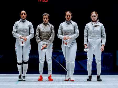 На фехтовальную дорожку в Ухане вышли двукратная олимпийская чемпионка прапорщик Яна Егорян, олимпийская чемпионка капитан Софья Великая, рядовой Ольга Никитина и запасная рядовой Анастасия Солдатова.