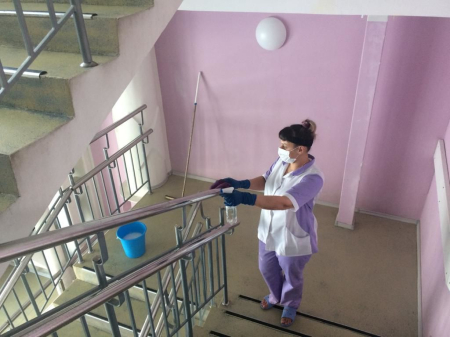 Как известно, коронавирус в течение нескольких суток сохраняется на поверхностях предметов. Поэтому уборщицы производственных и служебных помещений СК «Океан» (г. Вилючинск) филиала ФАУ МО РФ ЦСКА (СКА, г. Хабаровск) Маргарита Толстикова и Елизавета Михайлова не оставляют ему никаких шансов, обрабатывая рабочие зоны и технические помещения СК «Океан» с помощью дезинфицирующих растворов.