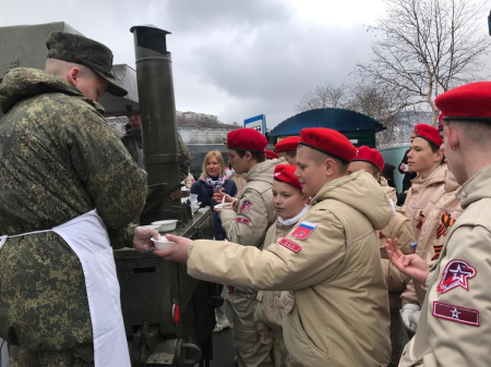 А после прохождения парадных коробок военные моряки пригласили всех желающих отведать сваренной на полевой кухне традиционной гречневой каши с тушенкой и горячего чая.