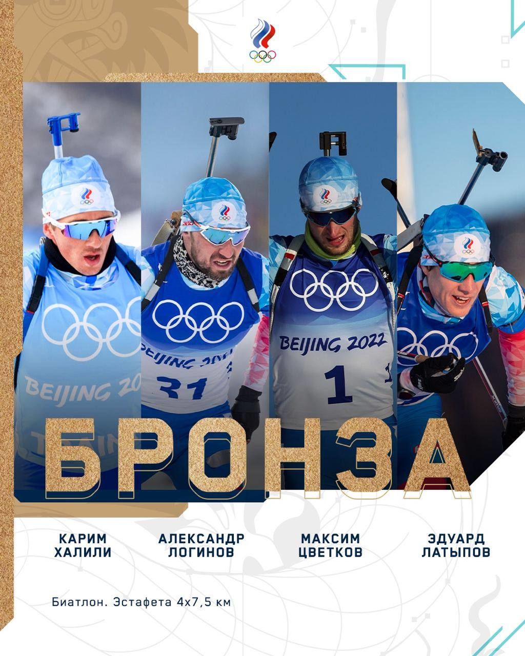 Биатлонисты Центрального спортивного клуба Армии - старший лейтенант Максим Цветков, лейтенант Александр Логинов, прапорщик Эдуард Латыпов и Карим Халили заняли третье место по итогам эстафеты 4х7,5 км в Пекине.