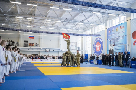 На открытии турнира с показательным номером выступили курсанты факультета спецназа Новосибирского военного института имени генерала армии Яковлева войск национальной гвардии РФ.