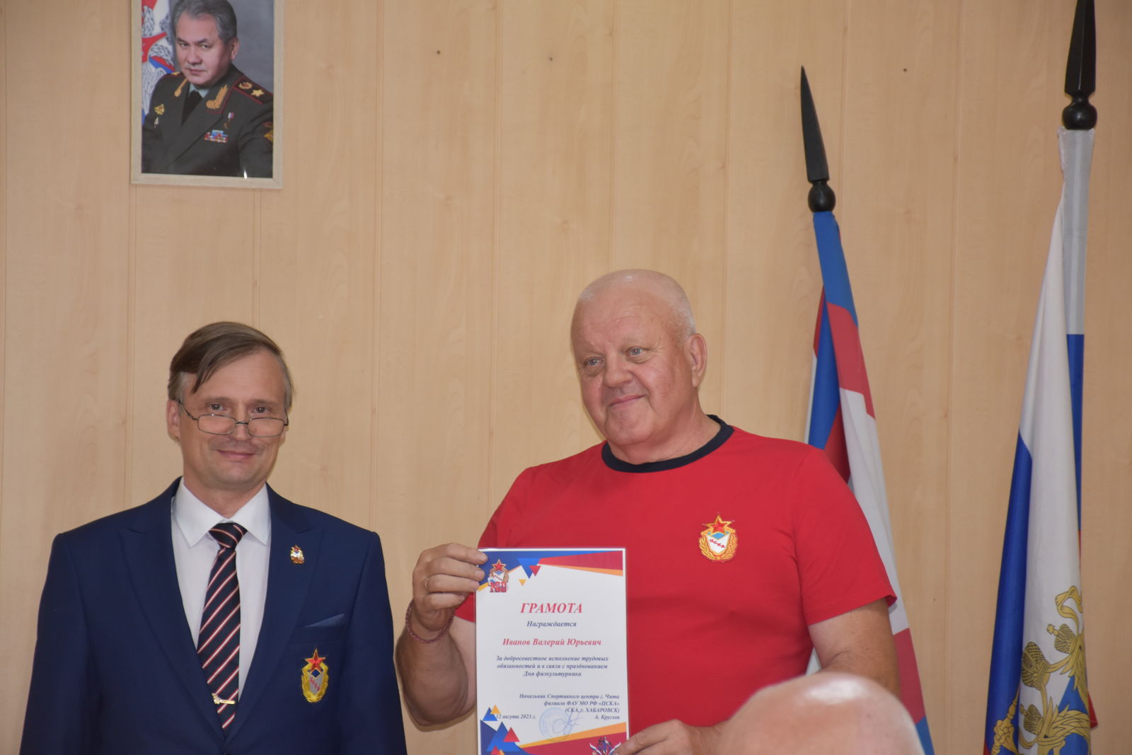 В ходе мероприятия начальник Спортивного центра Андрей Круглов зачитал приказ о поощрении личного состава Спортивного центра (г. Чита) филиала ЦСКА/Хабаровск в честь Дня физкультурника.