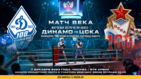 Грандиозное событие под названием «Матч века» посвящено столетнему юбилею «Динамо» и ЦСКА. Почти век прошёл с момента первой матчевой встречи команд. Теперь зрители увидят семь бескомпромиссных поединков в олимпийских весовых категориях, а также концертную программу.