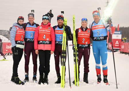 Три штрафных круга за всю дистанцию и 13 дополнительных патронов, итог - лучшее время старта - 1 час 12 минут 34,4 секунды. Второе место заняла сборная России-1, за которую выступали наши спортсмены Светлана Миронова, Анастасия Шевченко и Александр Поварницын (отставание 11,0 секунды; 1 штрафной круг + 11 доппатронов). На третьем месте в составе сборной России-4 оказался наш Эдуард Латыпов (+29,4; 3+10).