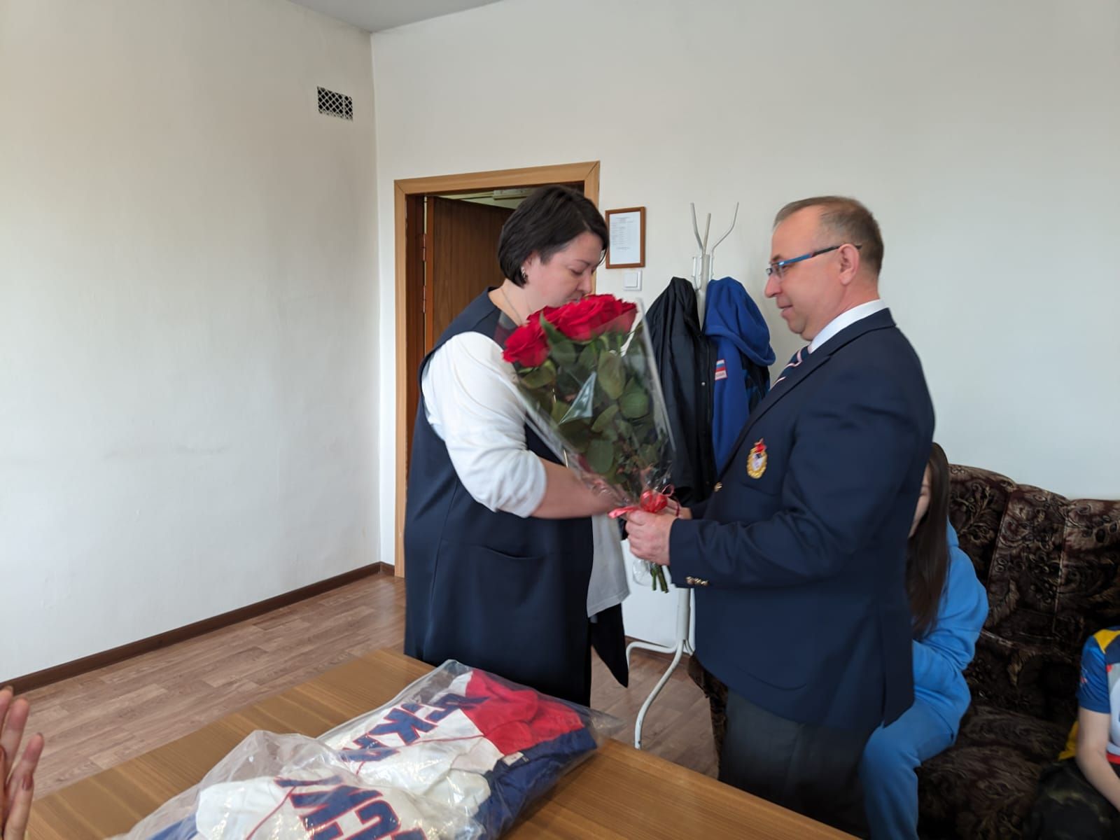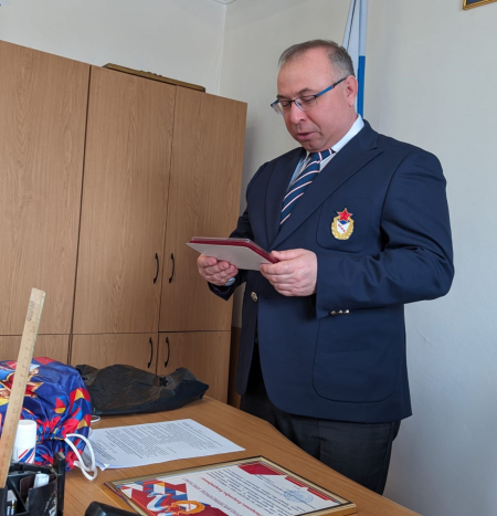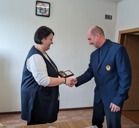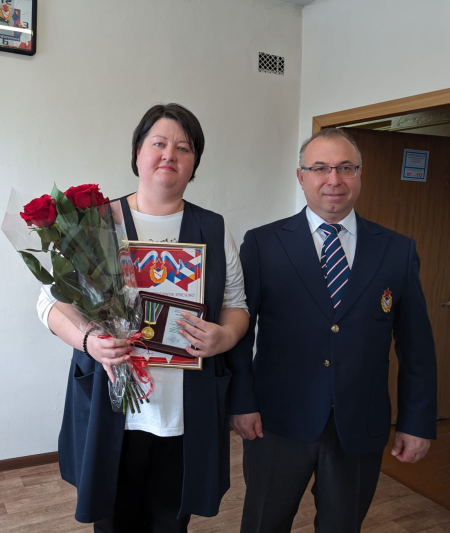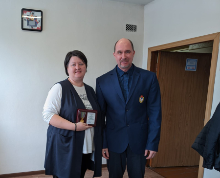 Заместитель начальника филиала Максим Иванов и заместитель начальника филиала по эксплуатации и развитию спортивных объектов Дмитрий Картошкин вручили врио начальника УСК (г. Улан-Удэ) Александре Кресс, муж которой в настоящее время находится в зоне проведения СВО, медаль «100-лет Министерству спорта России».