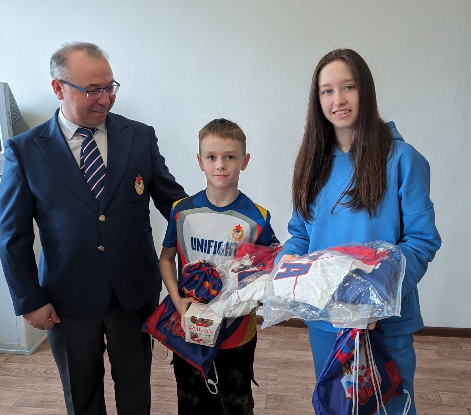 Кроме того, сладкие подарки, сувениры с символикой ЦСКА и спортивные костюмы были торжественно вручены детям Александры Кресс, которые очень ждут своего отца-военнослужащего и желают ему скорейшего возвращения домой с победой.
