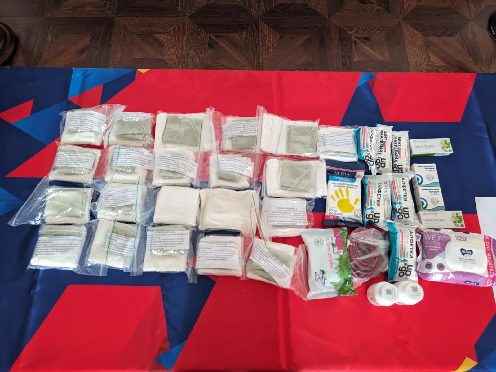 Сотрудниками армейского Клуба были закуплены сухой армейский душ, влажные салфетки, жгуты, бинты и витамины.