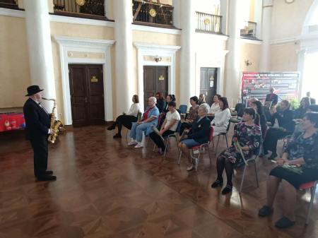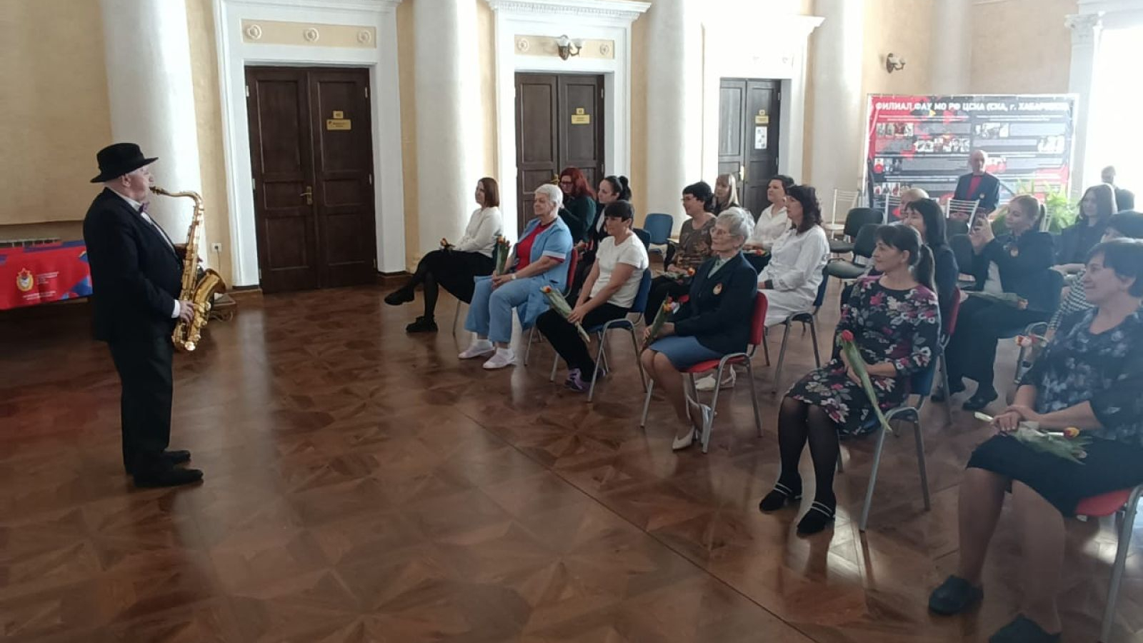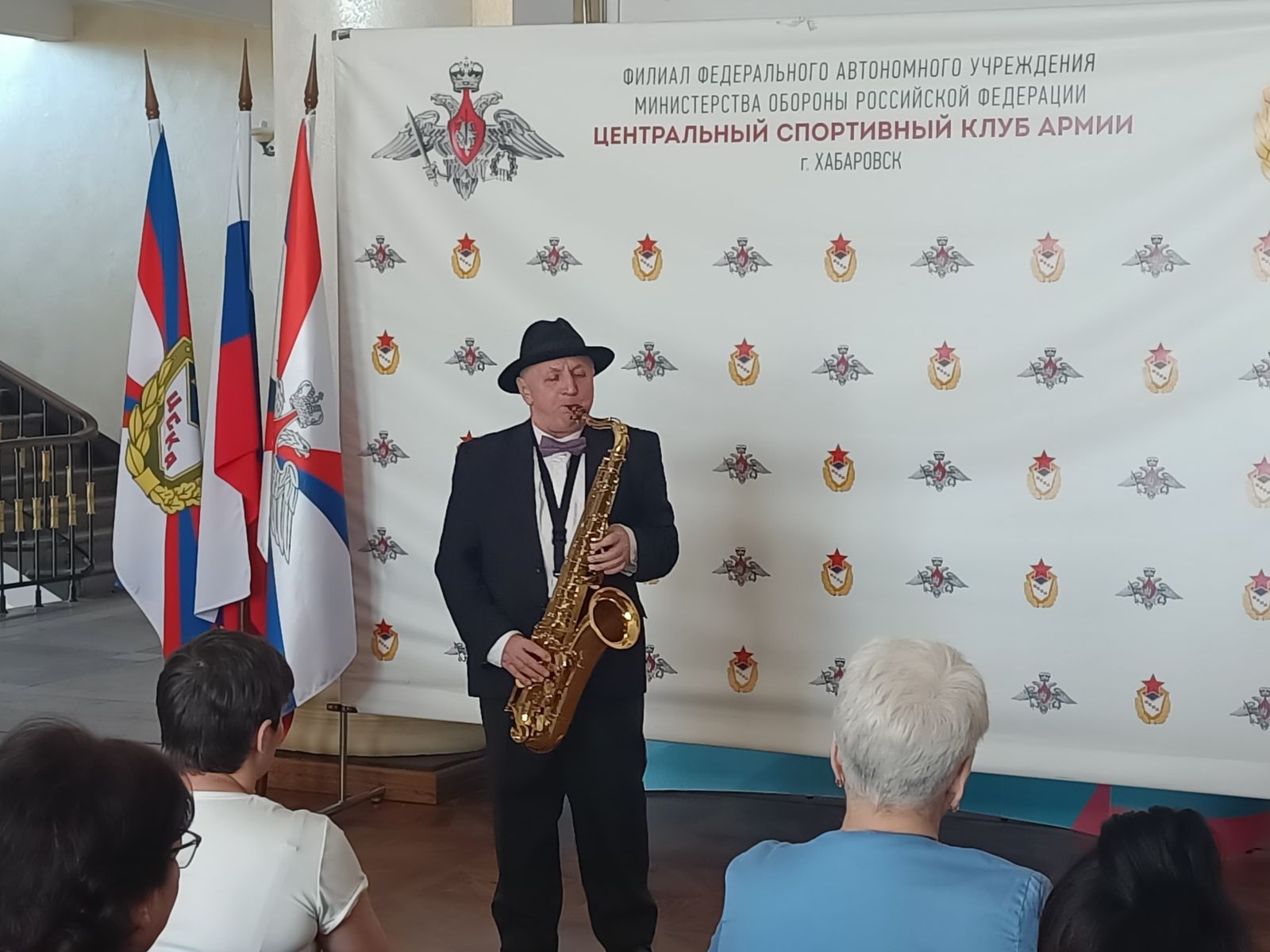 А затем для сотрудниц Хабаровского филиала ЦСКА выступил солист оркестра штаба Восточного военного округа саксофонист Виктор Бондаренко, который подарил виновницам торжества замечательные мелодии.