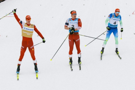 На протяжении почти всей гонки зрители смотрели обычный масс-старт: пелотон постепенно редел, без попыток вырваться вперед и серьезных перебежек. Изначально темп задавал Алексей Червоткин, но олимпийскому чемпиону не хватило сил, чтобы удержаться до конца. За 10 км до финиша впереди шли 14 лыжников, а на последней пятёрке осталось лишь восемь.