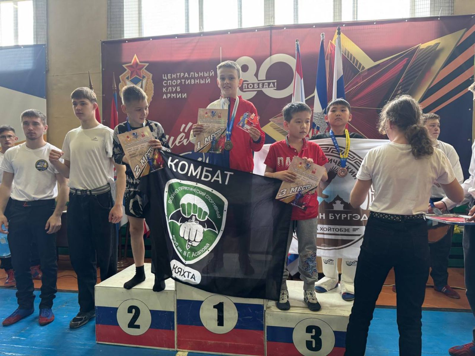 От имени депутата Народного Хурала П.С. Мордовского поздравления юным спортсменам передал его помощник, который поздравил участников фестиваля и их родителей с 80-й годовщиной Победы и пожелал детям расти настоящими патриотами своей страны, готовыми встать на её защиту.