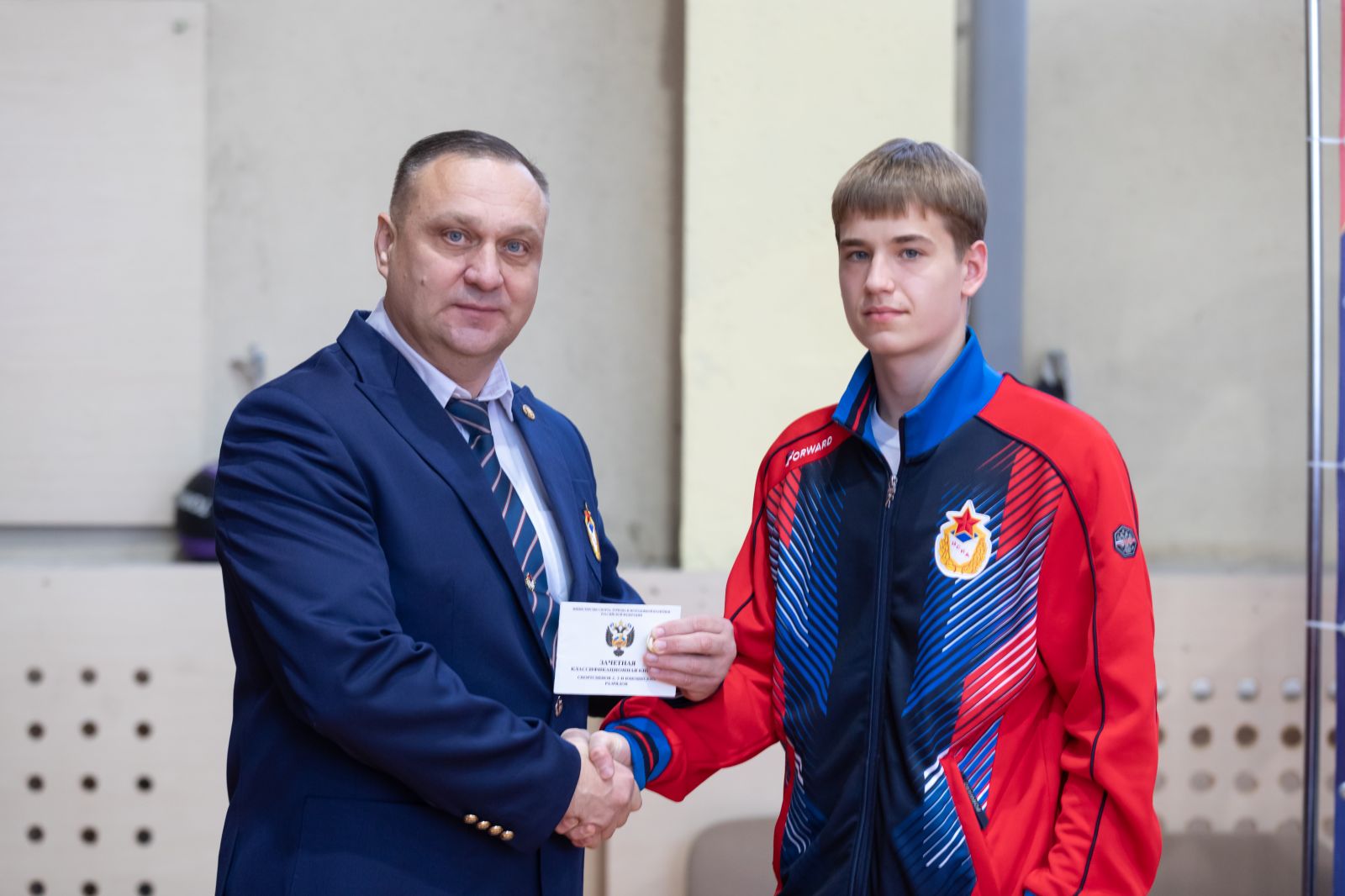 В торжественной обстановке обучающемуся спортшколы «ЦСКА-Самара» Матвею Подоплелову вручили нагрудный знак и зачётную классификационную книжку, подтверждающие присвоение первого юношеского спортивного разряда по боксу.