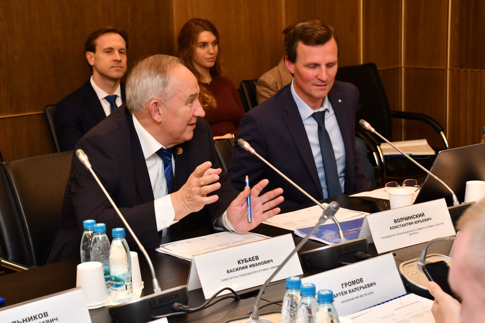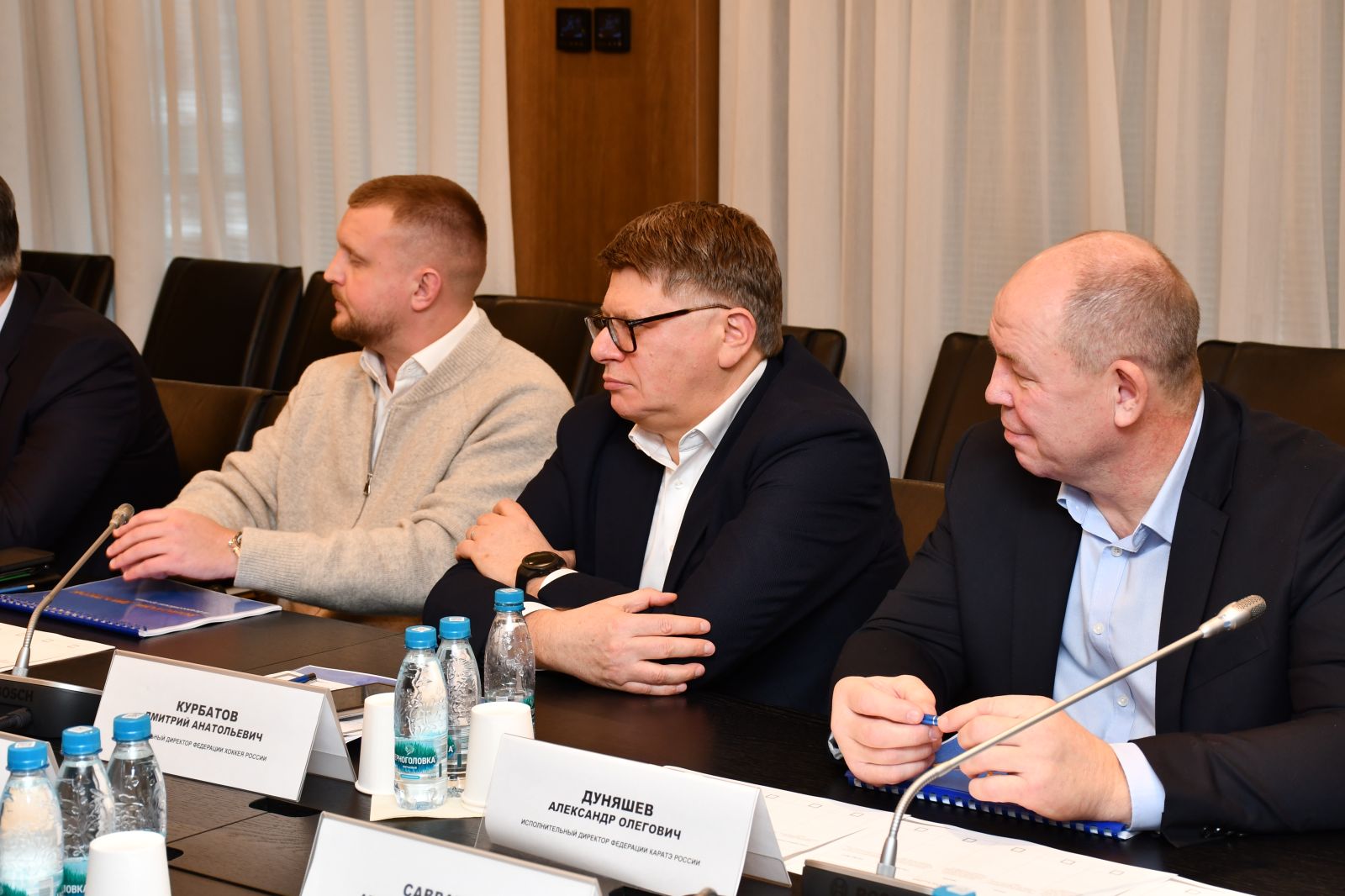 В заседании приняли участие: начальник ЦСКА полковник Артем Громов, заместитель директора Департамента лёгкой промышленности и лесопромышленного комплекса Министерства промышленности и торговли Российской Федерации Руслан Наниев, руководитель организационного комитета премии «Золотой Диалкон» Константин Волчинский, заместитель Председателя ОГО ВФСО «Динамо» Василий Кубаев, начальник отдела по связям с Федеральным собранием Департамента по взаимодействию с федеральными и региональными органами власти ОАО «РЖД» Алексей Смольников, генеральный директор Федерации хоккея России Дмитрий Курбатов, исполнительный директор Всероссийской федерации самбо Анастасия Кондратьева, исполнительный директор Федерации каратэ России Александр Дуняшев, первый заместитель председателя Комитета Государственной Думы по международным делам Светлана Журова, президент «Национального фитнес-сообщества» Елена Силина, председатель Ассоциации Производителей и Экспортеров Отечественных Спортивных Товаров и Оборудования Анна Максимова, соучредитель и директор по развитию Холдинга «СБК. Спорт Бизнес Консалтинг» Александра Савраева, исполнительный директор Всероссийского физкультурно-спортивного общества «Трудовые резервы» Павел Рожнов, спортивный предприниматель и управляющий партнёр Newman Sport Владимир Волошин.