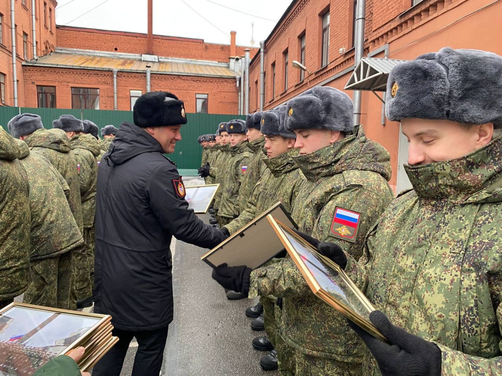 На построении новобранцам были выданы памятные фотографии с торжественной церемонии принятия Военной присяги.