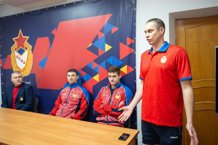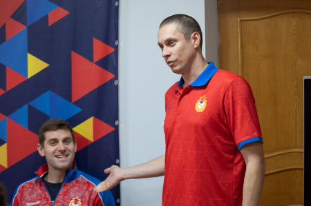 Начальник команды - старший тренер спортивной команды (по плаванию и прыжкам в воду) ЦСКА подполковник Алексей Алёнин представил юным армейским спортсменам олимпийцев — Евгения Лагунова и Николая Скворцова.