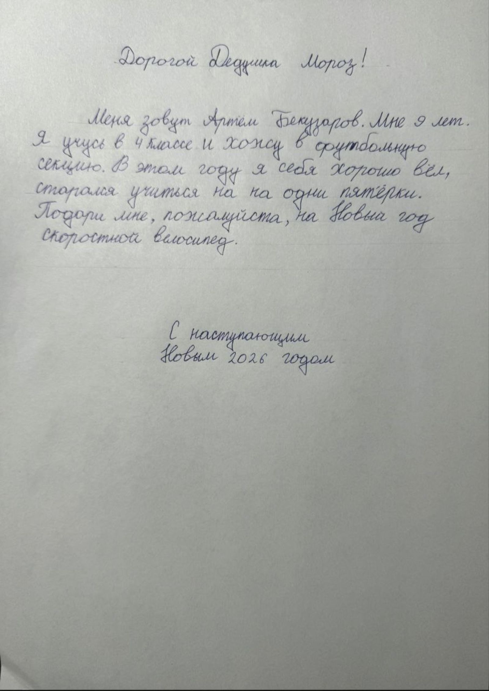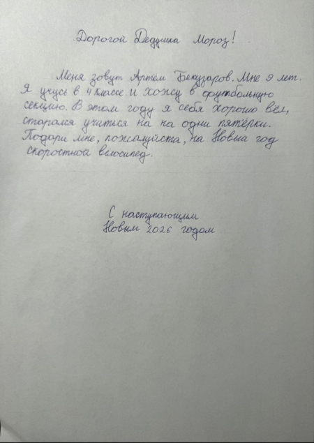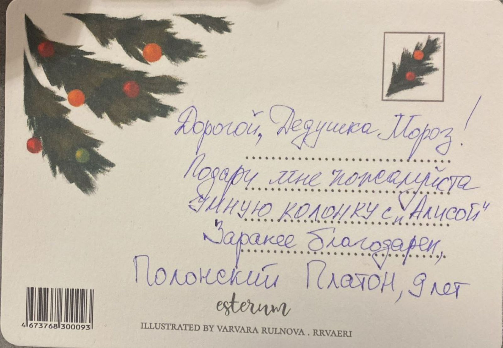 «Дорогой, Платон! Пусть Новый 2026 год принесет тебе много ярких, радостных событий! Желаю тебе, твоим родным и близким здоровья, счастья, чудесного настроения и, конечно же, исполнения желаний! А твое желание скоро исполнится, потому что твоя умная колонка с Алисой уже в пути и скоро будет у тебя!»