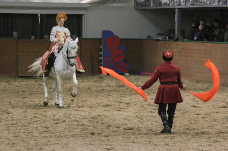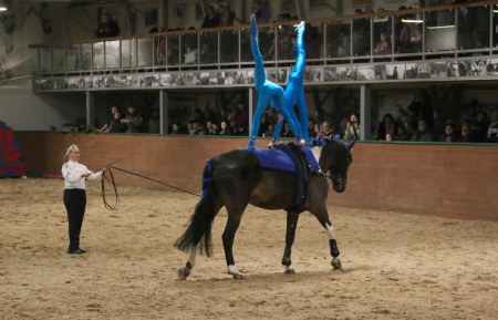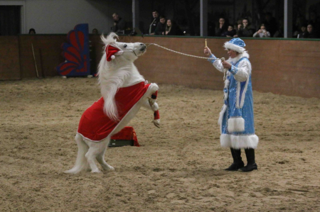 Продолжением стало показательное выступление по вольтижировке — «Танец снежинок», где принимали участие самые юные спортсмены. Представление сочетало акробатику и воздушную гимнастику на лошади.