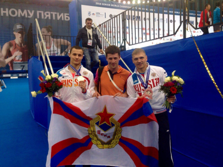 Представители ЦСКА неудачно выступили в первых двух упражнениях (плавание и фехтование), однако после соревнований в беге и стрельбе смогли подняться на четвертую позицию. В конкуре армейцы набрали максимальные 300 баллов, однако этого не хватило, чтобы догнать опытных представителей Южной Кореи Хван Ву Чжин и Чжун Вун Тэ. По итогам выступлений армейские спортсмены, капитан Илья Фролов и рядовой Олег Наумов завоевали «серебряные медали».