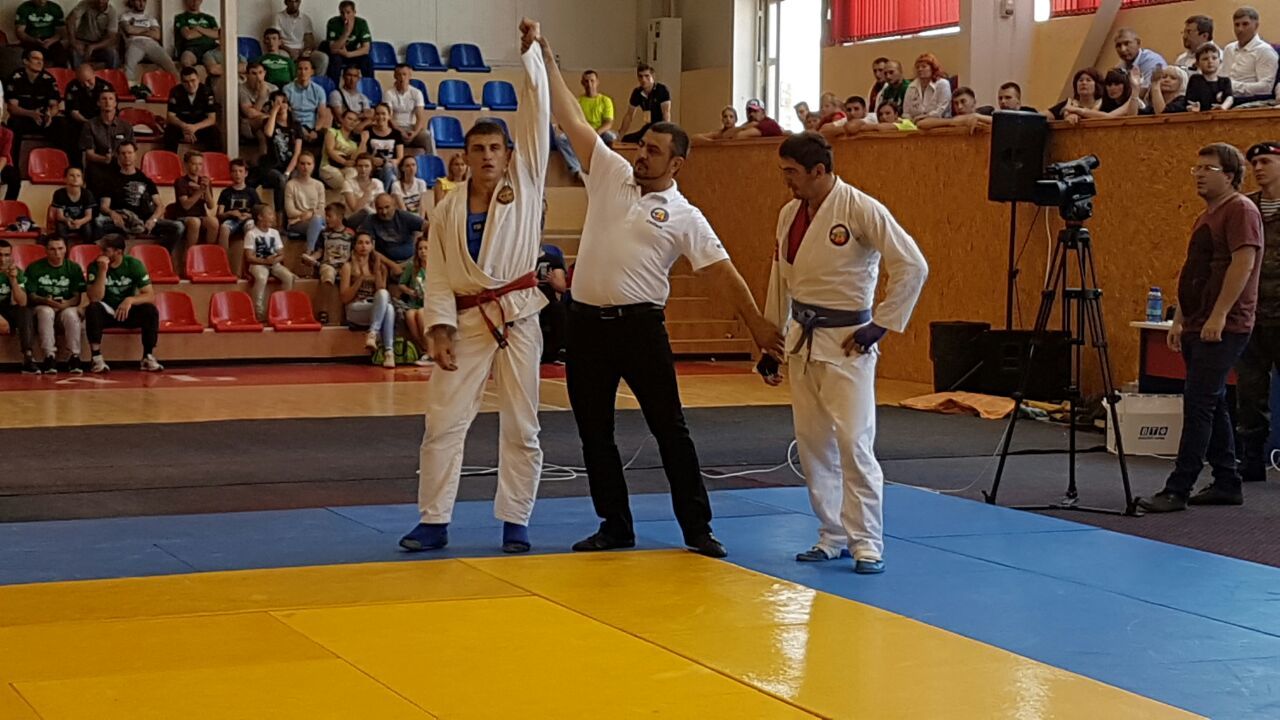 В концовке равного боя армеец нанес действующему чемпиону решающий удар, совершил бросок и завоевал титул чемпиона России.
