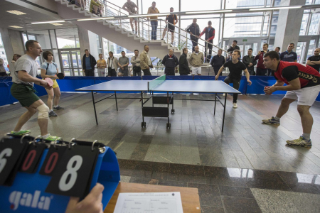 Спортсмены состязаются в личном и командном зачете на шести столах для настольного тенниса. Согласно регламенту соревнований, все команды разделены на три группы — А, Б и В. В группе Б по круговой системе соревнуются шесть команд, а группы А и В разделены на подгруппы: в группе А — 4 подгруппы (всего 15 команд), в группе В — 6 подгрупп (19 команд). Две лучшие команды из каждой подгруппы выходят в полуфиналы своих групп. Победители групп А и В определятся завтра, 10 июня, а победители группы Б — сегодня, 9 июня.