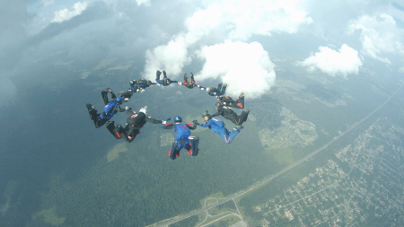 В последний день 40-го чемпионата мира среди военнослужащих по парашютному спорту 15 представителей команд-участниц юбилейного турнира совершили «Прыжок дружбы» с высоты 4000 метров.