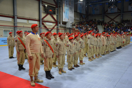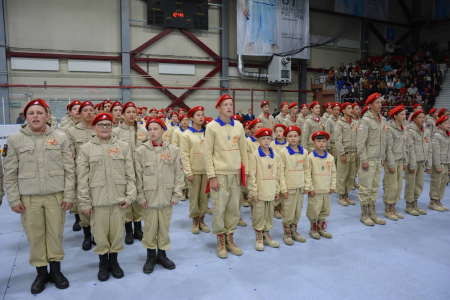 В 12.00 по местному времени на арене Дворца спорта «Кристалл» построились кандидаты в юнармейцы, рота почетного караула армейского корпуса, военный духовой оркестр Южно-Сахалинского гарнизона и малый состав Академического ансамбля песни и пляски Российской Армии им. А.В. Александрова