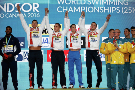 Наша команда показала второй результата в квалификации (3:08,39), уступив французам 0,33 секунды (3:08,05), однако в финале опередила соперников на 1,45 секунды – 3:05,90 против 3:07,35 у французской команды. Большой вклад в победу нашей сборной внес армеец Морозов, который показал лучшее время финала – 45,42 секунды. Бронзовыми призерами эстафеты стали австралийцы (3:07,76).