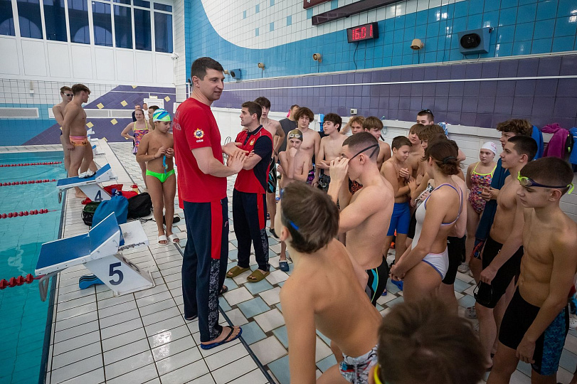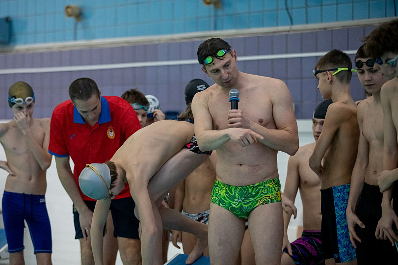 Именитые армейские пловцы Евгений Лагунов и Николай Скворцов показали ряд упражнений и приёмов обучающимся самарской спортшколы ЦСКА на практике.