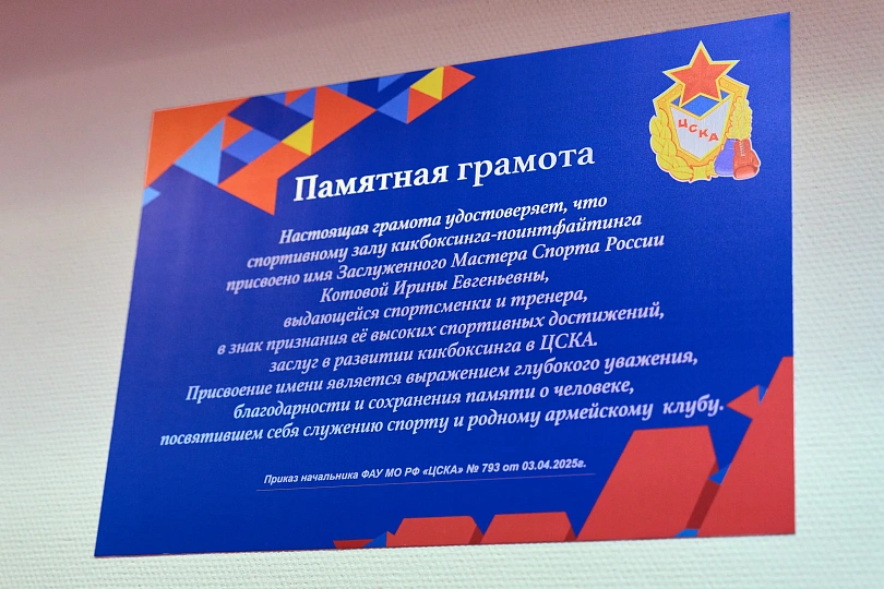22 декабря состоялась церемония присвоения имени заслуженного тренера Ирины Котовой спортивному залу кикбоксинга и поинтфайтинга ЦСКА Спортивного комплекса (Ледовый)