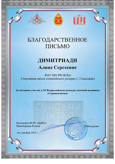 За активное участие в конкурсе Алина Димитриади получили благодарственное письмо за подписью начальника Центрального дома Российской Армии им. М.В. Фрунзе МО РФ Василия Мазуренко. Именно ЦДРА является организатором конкурса.