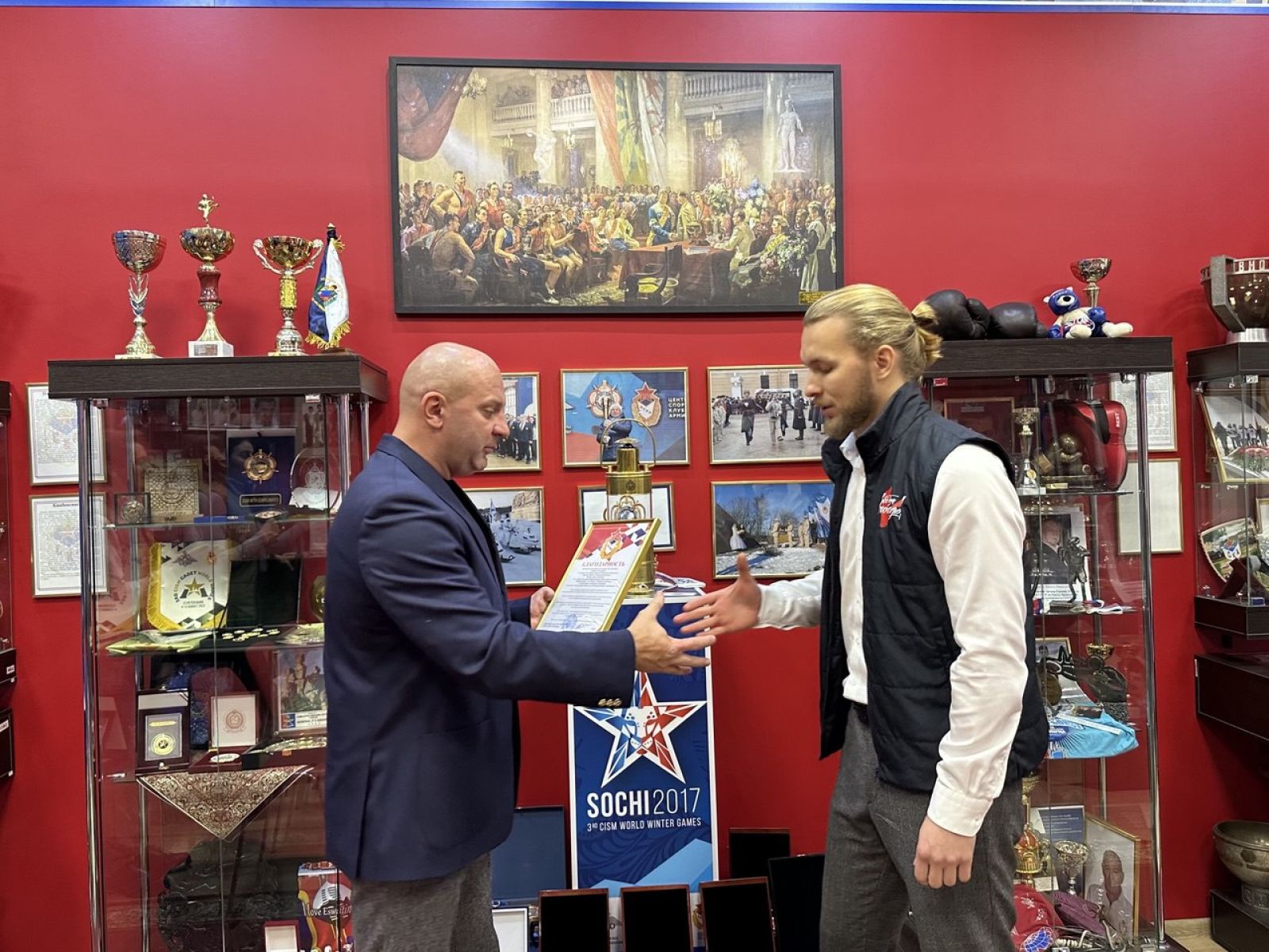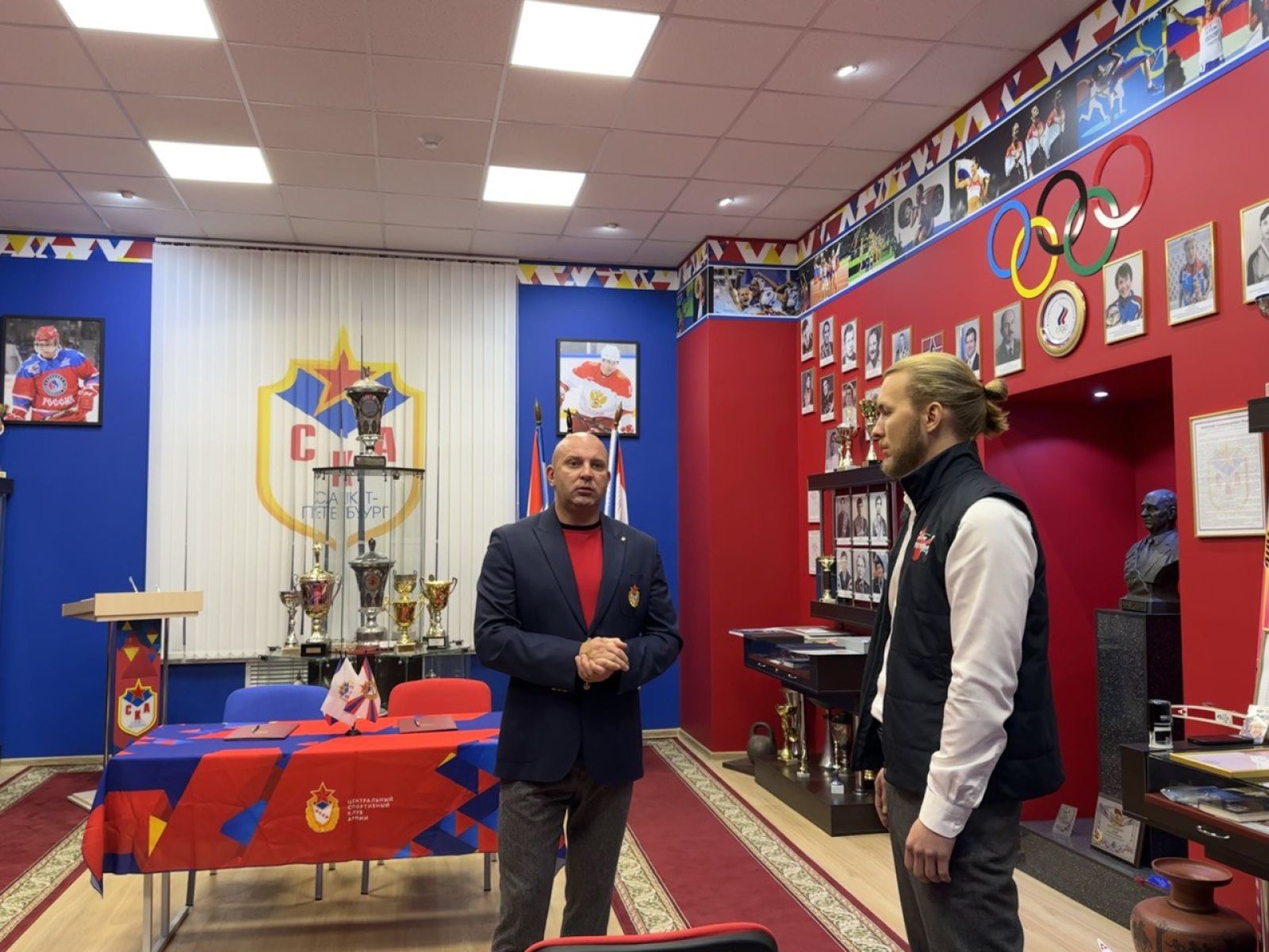 В Санкт-Петербурге на базе СК (ул. Инженерная) в музее славы СКА состоялась рабочая встреча, в которой приняли участие заместитель начальника филиала ФАУ МО РФ ЦСКА (СКА, г. Санкт-Петербург) Андрей Шаталов и куратор по молодёжным проектам Регионального Исполкома Народного фронта в Ленинградской области Денис Феденко.